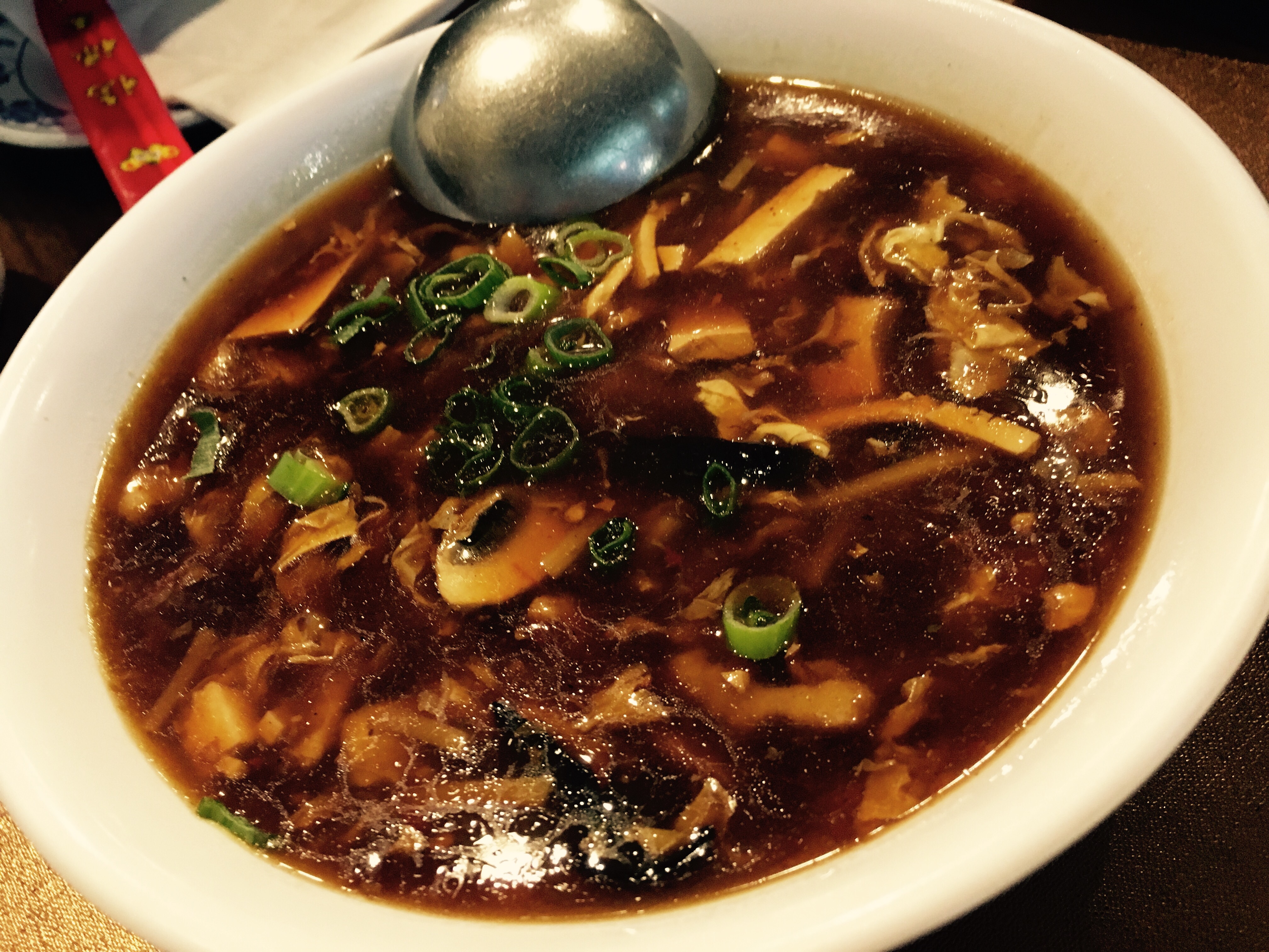 My belly was warmed,and my palate was impressed by the combination of flavors from the Hot Sour Soup. Most places, especially fast take-out, the broth tends to look yellow and “cloudy” from the eggs, cooked in the soup. But notice the rich burgandy color of this broth – that’s exactly what the broth is supposed to look like. It also had a warm, comforting savoriness. The variety of sliced tofu, mushrooms, bamboo shoots and lily buds were well-cooked and helped balance the spiciness from the dried chilis, enhanced by the white vinegar.