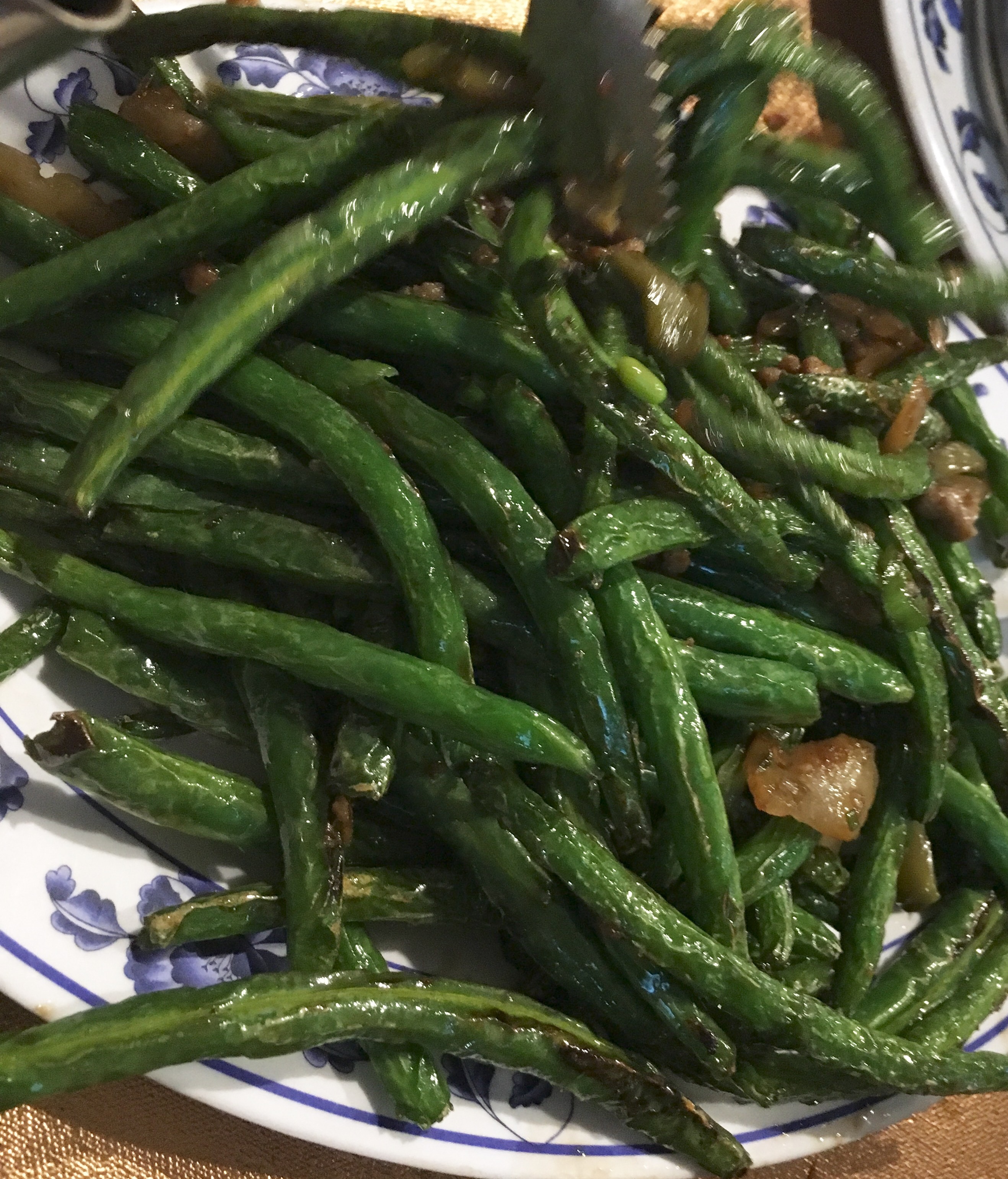 To make room for more food, the trick is to eat greens, as my Grandma and Mom taught me. As simple as these Green Beans look, they were delicious! I grew up eating dishes like this so eating veggies was never an issue for me as a child. Most greens tend to be more greasy or oily. These green beans were sautéed with onions, garlic, dried chilis and soy sauce. This dish inspired me to make this at home. But it’s not exactly the same because of the dried chilis they used.