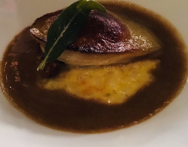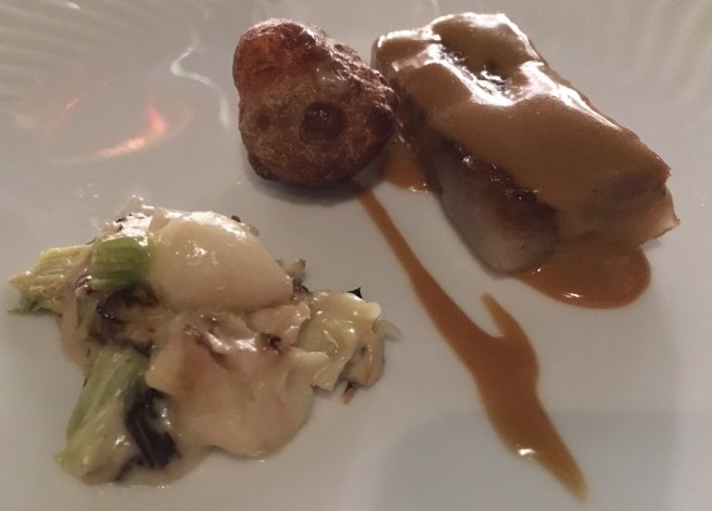 Salmon Creek Farm Kurobuta Pork. A surprising pork course of caramelized turnip top “pierogi,” savory cabbage, glazed garden turnips, and “Sauce Raifort.” Pork, cabbage and turnips tend to be boring and bland – each alone. But well-cooked with a nice sauce, exquisite! I savored every bite of the pork and was impressed by the flavor of the turnips due to the caramelization. The tasty cabbage helped cut through the fat from the pork.