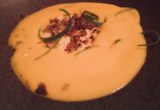 White Truffle Porridge. A delightful autumn dish with Red Kuri Squash, chestnut, and white sage. The porridge wasn’t heavy as I expected, especially since it was made of squash. A creamy texture with a slight savory and sweet taste along with a touch of Thanksgiving and Christmas from the chestnuts.