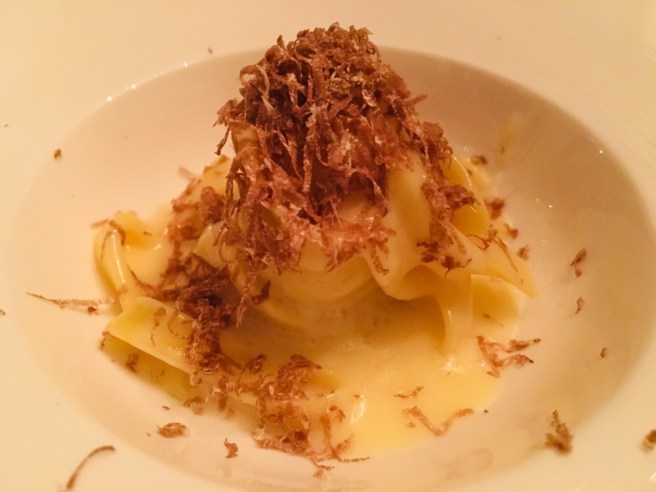 “40 Egg Yolk Hand Rolled” Tagliatelle. I rarely order pasta at a restaurant unless I know for a fact that it’s extraordinary or so much better than what I can make at home. Chef’s tagliatelle was exceptional. Hand-made, perfectly cooked pasta that was delicate – I would had never guessed that it was made of 40 egg yolks. Along with the farm butter and white truffle, I savored and enjoyed every bite because it slowly melted gently in my mouth.
