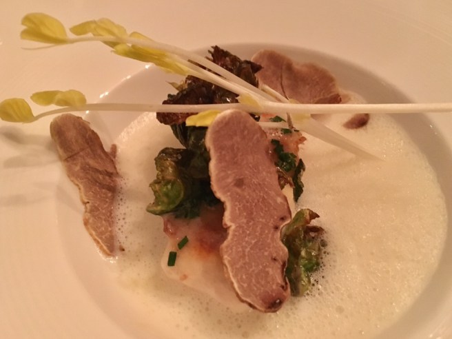 Truffle Butter Poached Haddock. Haddock can be quite bland, and brussels sprouts can have a bitter-like aftertaste, if not prepared well. In this beautiful dish, the espuma (the foamy, “sponge bath” of the white truffle for the fish) and “licorice” taste of the fennel not only enhanced the sweetness of the filet of the haddock but caused a bomb of variety of flavors of the ingredients in my mouth. The taste of the brussels sprouts was balanced by the espuma, and it was the best brussels sprouts that I’ve ever had.