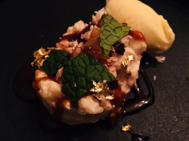 Frozen Acquerello Rice. An alluring dessert with salted pistachio, butterscotch, candied orange and sicilian olive oil. A masterpiece, I examined every element and the overall work of art. I particularly enjoy the tastes of the ingredients mentioned, so by taking a spoonful of each element together, it blew me away. The pistachio and olive oil balanced the sweetness of the candided orange and strong flavor of the butterscotch.